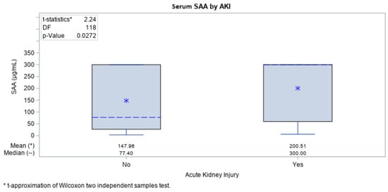 An analysis was performed to evaluate any correlations between the biomarkers (IL-6 and SAA) and the frequency of AKI in each COVID-19 group. Among the biomarkers, we found that IL-6 (p = 0.006) and SAA (p = 0.027) levels were both significantly higher in those patients who experienced AKI (Figure 3 and Figure 4).