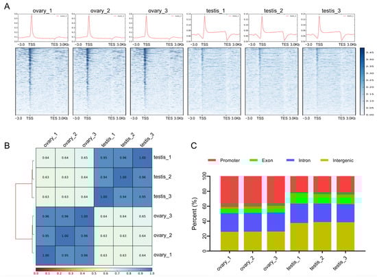 We performed ATAC-seq to explore the chromatin accessibility of the common carp ovaries and testes. We generated 223.52 million raw reads. After quality filtering, 220.62 million clean reads were retained and mapped to the reference genome [] (Table S1). The quality of ATAC-seq libraries can be assessed based on the distribution of reads near transcription start sites (TSS). As shown in Figure 1A, the reads were highly enriched in TSS, implying a low background in our profiles. Pearson’s correlation heatmap indicated a high level of consistency within groups but a low consistency across groups (Figure 1B).