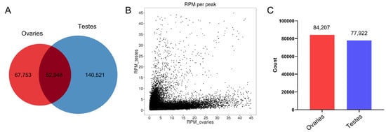 Identification of differential peaks. (A) The Venn diagram of peaks between ovaries and testes. (B) The Scatter plot of RPM for peaks in ovaries and testes. (C) Differential accessible regions between ovaries and testes.