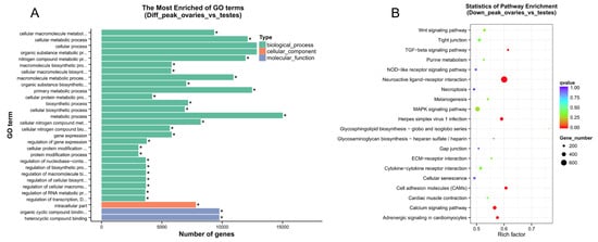 Genes associated with differentially accessible regions were denoted as differentially accessible genes (DAGs). In comparing ovaries to testes, more accessible regions were associated with 34,037 genes, and less accessible regions were associated with 24,999 genes. The overlapping 17,605 genes were associated with increased and decreased chromatin accessibility regions simultaneously, implying that they could be co-regulated by several regulatory elements (Table S3). These DAGs were then subjected to enrichment analysis. The most significant enrichment GO terms were cellular, metabolic, and biosynthetic processes at the Biological Processes level, intracellular at the Cell Component level, and organic cyclic compound binding and heterocyclic compound at the Molecular Function level (Figure 3A). Although the KEGG analysis of all DAGs showed that no significant pathway was enriched, genes more accessible in testes showed significant enrichment in the TGF-beta signaling pathway, neuroactive ligand–receptor interaction, and calcium signaling pathway (Figure 3B).