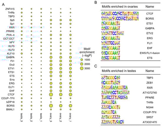 TF binding motifs enriched in open chromatin regions. (A) The bubble diagram of motifs enriched in each sample. (B) Top ten motifs enriched in ovary-biased peaks. (C) Top ten motifs enriched in testis-biased peaks.