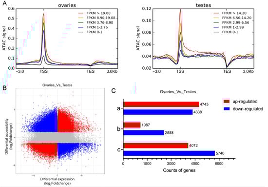 The relationship between chromatin accessibility and gene expression in common carp gonads. (A) The abundance of ATAC signals in gene bodies and flanking regions among gene groups with different expression levels. (B) The underlying relationship between chromatin accessibility and gene expression. Red dots indicate positive correlations; blue dots indicate negative correlations. (C) The number of overlapping genes between DAGs and differential expression genes (DEGs). Red indicates up-regulated genes; blue indicates down-regulated genes. ‘a’ represents genes only associated with more accessible regions, ‘b’ represents genes only associated with less accessible regions, and ‘c’ represents genes simultaneously associated with increased and decreased chromatin accessibility regions.