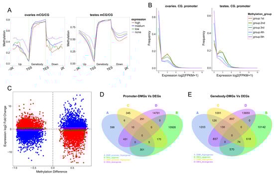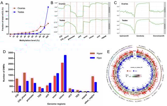 Methylation levels of mCGs in different genome regions and DMRs between the two groups. (A) Distribution of methylation levels in mCG contexts. (B) Methylation levels in different genome elements. (C) Methylation levels in gene bodies and flanking regions. (D) Number of DMRs in different genome elements. Red and blue represent hypermethylation and hypomethylation regions in ovaries compared to testes. (E) Distribution of DMRs in the genome. Red and blue dots represent hypermethylation and hypomethylation in ovaries compared to testes, respectively. CGI, CpG island; TSS, transcription start sites; TES, transcription end sites; TE, transposable elements.