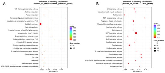 KEGG enrichment analyses of DMGs between ovaries and testes. (A) KEGG enrichment of promoter-DMGs. (B) KEGG enrichment of genebody-DMGs.