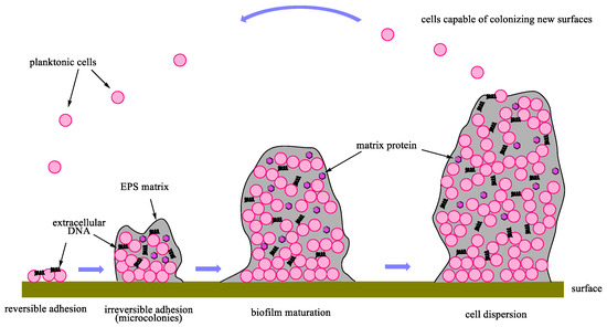 The formation of a biofilm is a multi-stage process that depends on the structure and properties of the colonized surface, as well as on the properties of the microorganisms. In the first stage, the bacteria settle in planktonic form and attach themselves to the substrate. Cells bind to the medium by nonspecific, reversible interactions. In the second step, a specific reaction takes place between the bacterial adhesins and the substrate. The close adherence of the microbial cell to the substrate for a sufficiently long time results in an irreversible connection. In this phase, microorganisms produce an extracellular polymeric substance (EPS), which becomes the extracellular matrix. In the next stage, the multiplication and differentiation of microorganisms are observed. In the final stage of biofilm formation, bacterial cells detach from the formed structure and, because of moving to new surfaces, give rise to a new biofilm (Figure 1) [26].