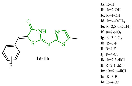 Haroun et al. [31] obtained a series of 4-thiazolidinone-thiazole hybrids (green color in Figure 2). The series of these derivatives showed antimicrobial activity with MIC in the range of 26.3 to 378.5 µM. Among them, the five most active derivatives (1b, 1g, 1h, 1m, and 1n) were tested for inhibition of P. aeruginosa biofilm formation. The percentage of reduction for 1h, 1m, and 1n was above 50% (61.34%, 62.69%, and 56.74%, respectively), recorded after application of concentrations equal to their MIC (125.4 µM, 162.1 µM, and 157.9 µM, respectively), indicating good biofilm-inhibiting potential. It is worth noticing that compounds with good antibiofilm potential had 3-F, 3-Br, or 2,6-diCl substituents in the benzylidene fragment of the molecule.
