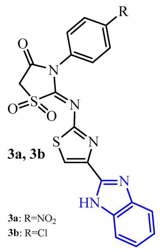 The structures of thiazolidin-4-one-thiazol hybrids with benzimidazole moiety (blue color).