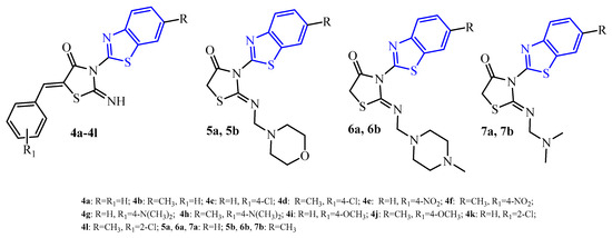 The Hemeda research group [34] synthesized two series of 2-iminothiazolidin-4-one derivatives with benzothiazole substituent (blue color in Figure 5) in position 3 of the thiazolidine ring (5-arylidene derivatives (4a–4l) and Mannich bases (5a, 5b, 6a, 6b, 7a, and 7b)). These compounds were evaluated for their C. albicans antibiofilm activity. Only 10 compounds (4a–4d, 4h, 4j, 5b, 6b, 7a, and 7b) that showed MICs in the range of 25 to 100 µg/mL in antimicrobial screening were studied for their antibiofilm activity. Most of the tested antifungal agents against two pathogenic Candida isolates, CA1 and CA2, demonstrated significant antibiofilm activity compared to the reference, fluconazole, but were not more effective. Compound 4j with the para-methoxy group in the benzylidene substituent showed the most antibiofilm activity against both CA1 and CA2 isolates (OD570mm = 0.297 and 0.218, respectively). The Mannich base 7b with a dimethylamino substituent in position 2 of the thiazolidine ring showed almost similar OD (OD570mm = 0.266) to compound 4j (MIC = 25 µg/mL) against only the CA2 pathogen, although its MIC value was 100 μg/mL. On the other hand, a lack of a substituent (compounds 4a and 4b) or 4-dimethylamino group (compound 4h) in the benzylidene fragment allows decreasing antibiofilm activity. Their OD570mm was in the range of 0.779 to 1.269. The remaining compounds (4c, 4d, 5b, 6b, and 7a) showed good to moderate antibiofilm activity against both isolates (OD570mm were in the range 0.307 to 0.530) comparing to fluconazole (OD570mm = 0.088 and 0.105 for CA1 and CA2, respectively).