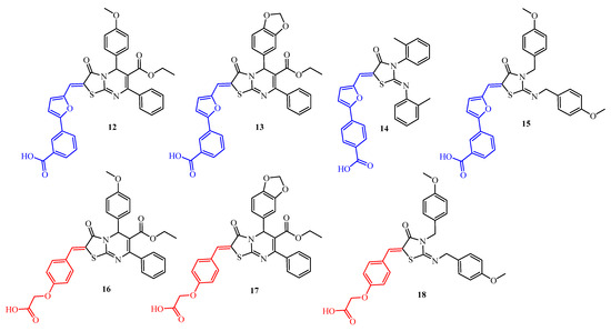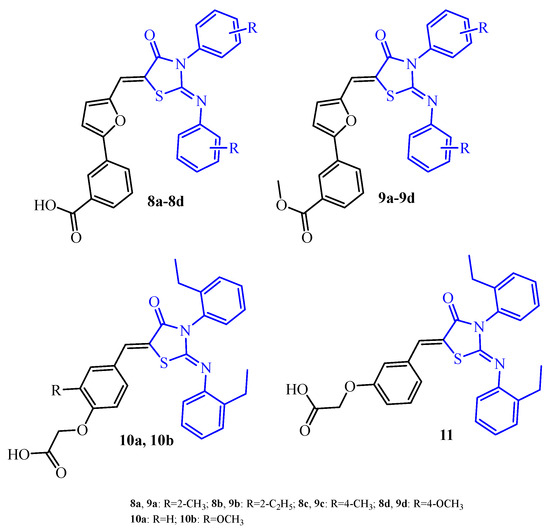 Pan et al. [35] designed and synthesized a series of 2-arylimino-3-arylthiazolidin-4-ones (8a–11) (blue color in Figure 6). All 25 compounds of this series were evaluated for their antibacterial and antibiofilm activity against S. epidermidis RP62A using a standard tube-dilution assay. Recently, some thiazolidin-4-one derivatives were documented with moderate antibiofilm activity against S. epidermidis RP62A, which caused their effect through inhibition of the YycG histidine kinase [36]. YycG plays an essential role in cell viability and related cell wall metabolism, biofilm formation, virulence, and antibiotic resistance. For these reasons, YycG histidine kinase may be considered as a potential target for this series of compounds.