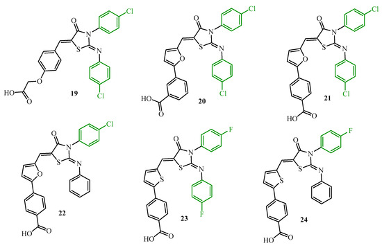 The next step for the continuation of research on the antibiofilm potential of 2-iminothiazolidin-4-one derivatives was a synthesis of halogenphenyl analogues (19–24) of compounds 8a–8d, 10a, and 14 (green color in Figure 8). This paper evaluated the inhibition effects of new derivatives on the autophosphorylation activity of the purified recombinant YycG’s activity on S. epidermidis biofilm, as well as their antibacterial efficacy in a rabbit subcutaneous S. epidermidis biofilm infection model [39]. The IC50 values of derivatives 19–24 toward YycG’s protein were in the range of 24.2 to 71.2 µM. The most active was compound 24 (IC50 = 24.2 µM), which demonstrated a twofold lower concentration than precursor 10b (IC50 = 47.9 µM). Furthermore, compound 24 was most effective against S. epidermidis biofilms. Their MBEC was 6.3 µM. Other derivatives (20–23), except 19 (MBEC = 50 µM), showed antibiofilm activity with MBEC = 12.5 µM, which was eight-fold better than precursor 10b (MBEC = 100 µM). It is worth noticing that the incorporation of a furan (20–22) and thiophene (23 and 24) ring and the introduction of halogen into the appropriate position of phenyl substituents may improve antibacterial and antibiofilm activities.
