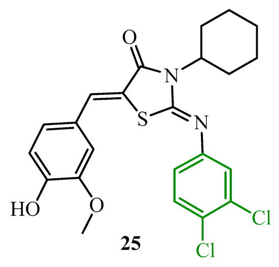 Hammad and co-workers carried out the synthesis and antimicrobial evaluation of two series of halogenated thiazolidin-4-ones against clinically relevant bacterial strains. The most effective, compound 25 (MIC = 32 µg/mL against methicillin-resistant Staphylococcus aureus NRS384 (MRSA USA300)), was tested for its antibiofilm activity against the above-mentioned staphylococcal strain (Figure 9). The test evaluated the percentage of eradication of MRSA USA300 mature biofilm in relation to DMSO. Compound 25, at 2× MIC, disrupted about 17% of the MRSA USA300 biofilm mass, which was better in biofilm eradication with comparison to the reference, vancomycin (which disrupted about 12% of the biofilm mass) [41].