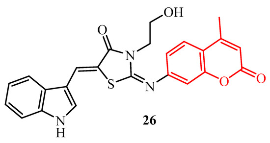 Another 2-iminothiazolidin-4-one derivative (26) conjugated with coumarin moiety (red color in Figure 10) showed high activity against Gram-negative bacteria Acinetobacter baumannii (MIC = 0.25 µg/mL). Viability of A. baumannii biofilm was decreased to 45% at a concentration of 2 µg/mL (8× MIC) [43].