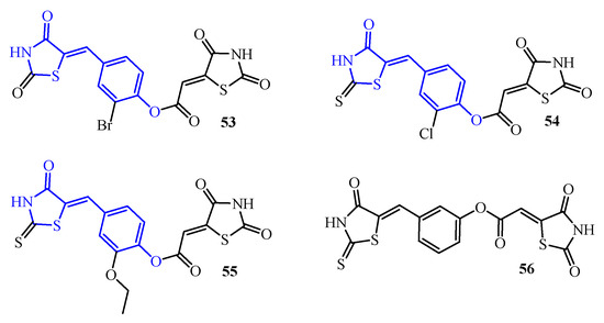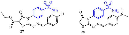 El-Hossary et al. synthesized a series of 2-(benzylidenehydrazono)thiazolidin-4-ones with a sulfonamide group in the third position of the thiazolidine ring (blue color in Figure 11). Among this series of derivatives, only two compounds (27 and 28) showed 70% and 80% inhibition of the biofilm formation in S. epidermidis at a concentration of 40 µM, respectively (Figure 11). Analyzing the substitution at the thiazolidine ring, the authors concluded that the presence of an ethylcarboxylate fragment at position 5 was not beneficial for antibacterial and biofilm inhibition activity [44].