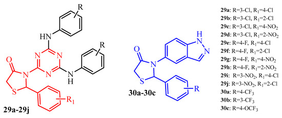 Cystic fibrosis (CF) is a genetic disorder that affects mostly the lungs. The most common organisms causing lung infections in CF patients are S. aureus, H. influenzae, and P. aeruginosa. Srivastava et al. [45] synthesized a series of thiazolidin-4-one-1,3,5-triazine hybrids (29a–29j) (red color in Figure 12). These compounds were evaluated for their antibiofilm activity against S. aureus NCIM 2079 and P. aeruginosa NCIM 2036 strains. The compounds 29a, 29c, 29d, 29f, and 29g showed moderate antibiofilm activity against S. aureus. Their MIC values, except 29f (MIC = 31.25 µg/mL), were 62.5 µg/mL vs. 3.91 µg/mL for standard vancomycin. Other thiazolidin-4-one-1,3,5-triazine hybrids exhibited mild antibiofilm activity (29b, 29h, and 29j with MIC = 125 µg/mL) or no activity (29e and 29i). In the case of P. aeruginosa, compounds 29b and 29c displayed no activity. It is worth noticing that compound 29f was the most active among other derivatives, and its MIC (7.81 µg/mL) was comparable to the reference, vancomycin. Other analogues exhibited moderate activity against P. aeruginosa with MIC in the range of 31.25 to 62.5 µg/mL.