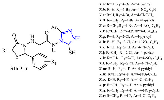 A series of 2-aryl-3-aminothiazolidin-4-one derivatives with 1,2,4-triazole moiety (31a–31r) (blue color in Figure 13) were synthesized and studied for antibacterial and antibiofilm activity. Screening results showed that derivatives inhibited the S. aureus biofilm formation with IC50 in the range of 25 to 100 µg/mL. There is a mild to moderate effect. Hybrid 31n with 4-nitrophenyl substituent in the 1,2,4-triazole ring and 4-fluorophenyl in position 2 of the thiazolidine ring was most effective in this series. Its IC50 was 12.5 µg/mL, which was a higher potential than the standard ciprofloxacin (IC50 = 25 µg/mL) [47].