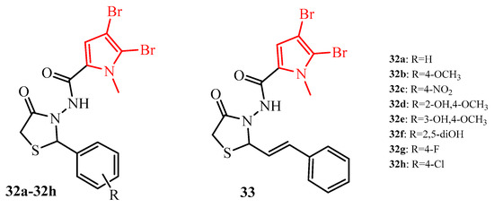 Another series of 2-aryl-3-aminothiazolidin-4-one derivatives with 2,3-dibromopyrrole substituent (red color in Figure 14) (32a–32h, and 33) showed very promising antibiofilm potential (Figure 14). The compounds of these series exhibited inhibition of S. aureus biofilm at a concentration in the range of 0.78 to 6.25 µg/mL; S. epidermidis biofilm with MIC = 3.125–12.5 µg/mL and E. faecalis biofilm was inhibited at a concentration in the range of 6.25–12.5 µg/mL. The compounds 32b–32h exhibited equally S. epidermidis antibiofilm activity comparable to reference vancomycin (MIC = 3.125 µg/mL). It is worth noticing that compounds 32b and 32c showed antibiofilm activity against S. aureus with MIC = 0.78 µg/mL, and compounds 32d, 32f, 32g, and 32h with MIC = 1.56 µg/mL, which speaks to their potential in the development of newer antibiofilm agents [48].