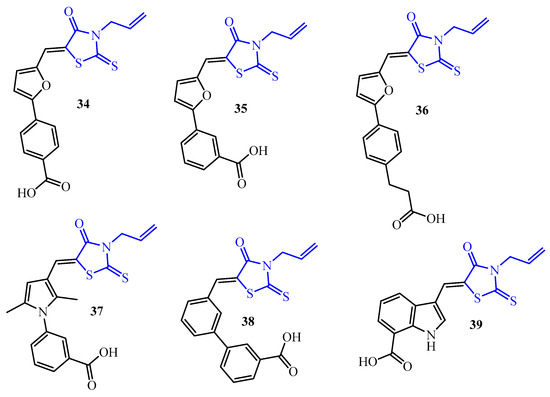 Gualtieri et al. reported antibiofilm activity of rhodanine derivative 34, namely 4-(5-{[4-oxo-3-allyl-2-thioxo-1,3-thiazolidin-5-ylidene]methyl}furan-2-yl)benzoic acid (Figure 15) [50]. This compound is a para-isomer of 3-(5-{[4-oxo-3-allyl-2-thioxo-1,3-thiazolidin-5-ylidene]methyl}furan-2-yl)benzoic acid (35) that was selected from the group of rhodanine derivatives with strong bactericidal properties and low toxicity [51]. Compound 34 as 35 and other representatives of this group showed their antibacterial activity by inhibition of bacterial RNA polymerase. In this study, the authors compare the activity of rifampicin with that of compound 34 and reference antibiotics on S. epidermidis biofilms (reference S. epidermidis ATCC 35984 biofilm and clinical isolates S. epidermidis DSM 3269, S. epidermidis 40004, S. epidermidis 48155). Compound 34 demonstrated a similar potential of biofilm inhibition to rifampicin against S. epidermidis (ATCC 35984) biofilm at a concentration of 20 µg/mL (3.9 ± 0.083 vs. 3.48 ± 0.087 log10cfu/mL). Moreover, 34 showed similar levels of activity at a concentration of 20 µg/mL toward three S. epidermidis clinical isolates: 4 ± 0.239 (DSM 3269), 3.8 ± 0.055 (40004), and 3.4 ± 0.032 (48155) log10cfu/mL [50]. As a continuation of these studies, a series of phenyl-furanyl-rhodanines and their analogues as inhibitors of RNA polymerase were synthesized and evaluated for their antibacterial and antibiofilm activity. Among the tested compounds, five derivatives displayed good activities on S. epidermidis biofilm at a concentration of eightfold the MIC (MIC = 25 µg/mL for 36–39 and 12.5 µg/mL for 35) and a decreased amount of bacteria by 2–3 log10cfu/well. It is worth noticing that compound 36 (homologue of 34) demonstrated similar activities on the three S. epidermidis strains (RP62A, 40004, and 48155) at fourfold and eightfold the MIC. These results highlighted the potential role of distancing the carboxylic group from the phenyl ring concerning biofilms. The most active against three S. epidermidis strains was compound 37 at a concentration of eight-fold MIC, with a decreased amount of bacteria by 2.8 log10cfu/well (RP62A), 2.3 log10cfu/well (40004), and 1.8 log10cfu/well (48155) [52].