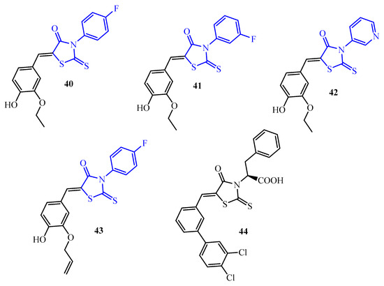 The next research concerned antibiofilm activities of the 3-arylrhodanines (40–43) (blue color in Figure 16). The evaluation of antibiofilm activities was carried out using a panel of Gram-positive (S. aureus, S. epidermidis, E. faecalis, Enterococcus faecium, and Enterococcus gallinarum) and Gram-negative strains (E. coli and P. aeruginosa) including resistant strains. The results of this study demonstrated that the 3-arylrhodanines 40–43 have potent antibiofilm activity against a wide range of Gram-positive bacteria. Compounds 40–43 exhibited good antibiofilm activity toward Staphylococcus spp. in the range of MBIC = 2.6–100 µM. Most active among them were compounds 40 and 43 with MBIC 2.6 µM against S. aureus ATCC 35556 and derivatives 40, 41, and 43 that inhibited biofilm growth at a concentration of 8.8 µM against methicillin-resistant S. aureus MRSA-47263.