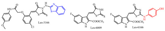 The rhodanine derivative (Les-3166) with benzothiazole moiety (blue color in Figure 17) induced significant degradation of the P. aeruginosa biofilm after 24-h exposure to all examined concentrations. The most pronounced antibacterial effects were observed at concentrations of 10, 50, and 100 µM, resulting in reductions of 37%, 34%, and 58%, respectively, compared to the control. In turn, the 5-(indol-3-yl)methylidenerhodanine derivative (Les-6009) exhibited the ability to inhibit the formation of P. aeruginosa biofilm at concentrations of 10, 50, and 100 µM, leading to decreases in biofilm biomass of 28%, 29%, and 45%, respectively, compared to the control. Notably, the replacement sulfanyl group at the second position of the thiazolidine ring by a 4-hydroxyphenylamine moiety (Les-6166) (marked red in Figure 17) did not induce any changes in biofilm eradication at any tested concentration [55].