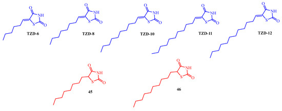 The interesting group of antibiofilm compounds was also the 5-alkylidenethiazolidine-2,4-diones (TZD-6, TZD-8, TZD-10, TZD-11, and TZD-12) and some of their saturated analogues (45 and 46) synthesized by Kagan and co-workers (blue and red colors in Figure 18, respectively) [56]. The compounds were tested for their antibiofilm activity against Candida albicans. The antibiofilm activity (as measured by the biofilm’s metabolic activity) was evaluated at sub-MICs. The MIC for TZD-10, TZD-11, TZD-12, and saturated analogues 45 and 46 was >200 μg/mL, whereas TZD-6 and TZD-8 showed activity against C. albicans at MIC = 50 μg/mL. A concentration of 100 μg/mL TZD-10 inhibited 61% of biofilm formation. On the other hand, TZD-6 and TZD-8 inhibited 50% and 43% of biofilm formation, respectively, at a concentration of 6.25 μg/mL. This effect depended on the length of the alkyl chain. In the case of TZD-12, when the alkyl chain consists of 12 carbons, antibiofilm activity is almost abolished.