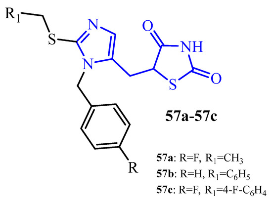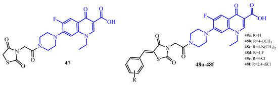 Analysis of the antibiofilm activity of TZD-norfloxacin hybrids (47, 48a–48f) showed that these derivatives were most active against S. aureus strain with MBEC in the range of 4.9 to 39.0 μg/mL (norfloxacin fragment marked blue color in Figure 19). The most active compounds among them were 47 (unsubstituted hybrid in thiazolidine ring), 4-fluorobenzylidene derivative (48d), and 2,4-dichlorobenzylidene derivative (48f) with MBEC = 4.9 μg/mL. Furthermore, compound 47 was most effective against E. faecalis (MBEC = 9.8 μg/mL) and E. coli (MBEC = 39.0 μg/mL). Compounds 48b, 48c, and 48f proved to be the most effective against the Gram-negative strain of P. aeruginosa with MBEC = 78.1 μg/mL. On the other hand, TZD-norfloxacin hybrids (47, 48a–48f) showed poor activity against fungal strains (C. albicans and C. parapsilosis). The values of their MBEC were in the range of 156.2 to 312.5 μg/mL for C. albicans and 156.2 to 2500 μg/mL for C. parapsilosis, except 48b (MBEC = 78.1 μg/mL) [68].