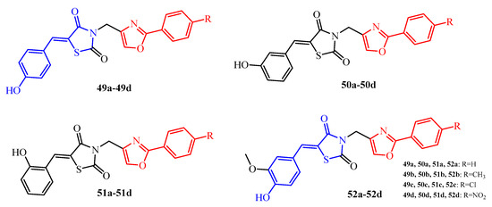 The replacement of the norfloxacin scaffold by 2-aryl-1,3-oxadiazole moieties (49a–52d) (red color in Figure 20) practically abolished antibiofilm activity against the S. aureus, E. faecalis, E. coli, and P. aeruginosa strains with MBEC in the range of 156 to >625 μg/mL, whereas activity against C. albicans biofilm was more effective than the activity of the TZD-norfloxacin hybrids (MBEC 39–156 vs. 156.2–312.5 μg/mL) [69].