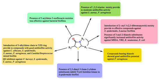 Previous information about the antibiofilm activity of thiazolidin-4-ones was unsystematic and generally found in reviews about the biological potential of thiazolidin-4-ones [25]. Nevertheless, over the last two decades, various thiazolidin-4-one derivatives have been tested for their antibiofilm properties, and some of them have demonstrated promising results.
