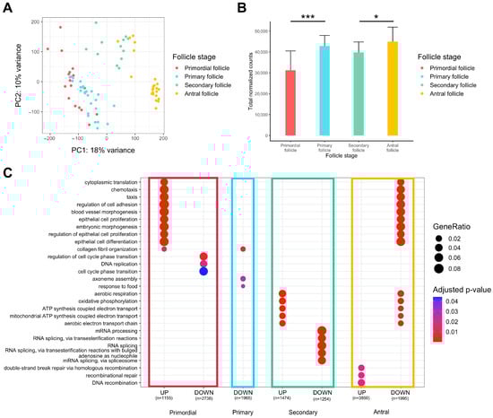 Differential expression analysis of transcriptomic signature changes along the different stages of folliculogenesis (dataset from Zhang et al. (2018) []). (A) Principal component analysis of the whole expression dataset removing the 10% genes with the lowest variance. (B) Comparison of the normalized read counts total between the different follicle stages (significance assessed with a t-test, * p < 0.05, *** p < 0.005). (C) Comparative Gene Ontology enrichment analysis according to the up- or downregulation of transcripts between all four follicle stages. GeneRatio corresponds to the fraction of differentially expressed genes (DEGs) found in each Gene Ontology set.