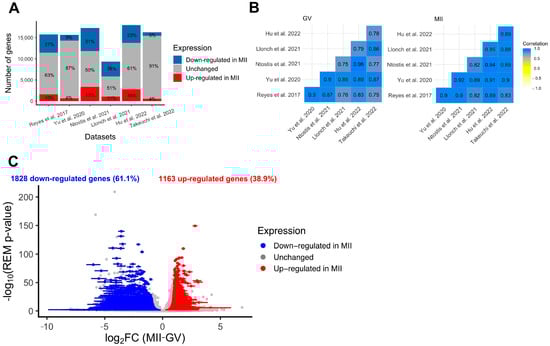 Differential expression analysis of genes during the GV-to-MII oocyte transition. (A) Results of individual differential expression analysis for the six datasets evaluated in this study. Numbers represent the percentage of genes upregulated, downregulated, or stable in MII versus GV oocytes. (B) Correlation of the normalized expression of all expressed genes for the six datasets evaluated in this study, respectively, for GV and MII oocytes. (C) Volcanoplot of the meta-analysis result for the six datasets evaluated in this study. A random effects model based on effect size (log2FC, difference of expression between MII and GV oocytes) and p-values from each dataset was applied. One gene is represented by one dot. A total of 2991 significant DEGs were identified (summary adjusted p-value from the random effect model < 0.05 and sign of log2FC consistent in all 6 studies). Blue dots represent significant DEGs downregulated in MII oocytes compared to GV. Similarly, red dots represent significant DEGs upregulated in MII oocytes compared to GV oocytes. The interval confidence of the summary log2FC is represented by the bars associated with the dots for each DEG [,,,,,].