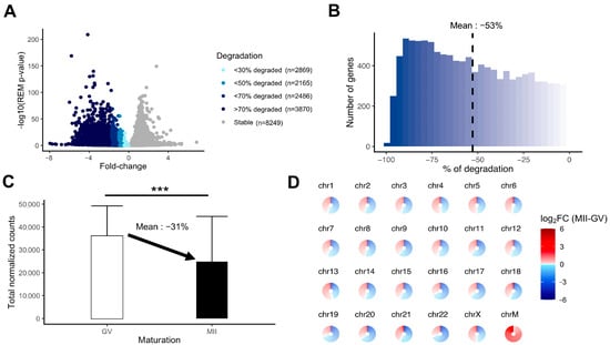 Measurement of the degradation of the maternal mRNA content in MII oocytes. (A) Volcanoplot of the meta-analysis result (MII versus GV) colored by the intensity of degradation between GV and MII stages (stable, <30% of degradation, <50% of degradation, <70% of degradation, or >70% of degradation). (B) Histogram focusing on the extent of degradation in downregulated transcripts in MII versus GV oocytes. (C) Comparison of total normalized counts between the GV and MII oocytes (significance assessed with a t-test, *** p < 0.005). (D) Assessment of degradation by chromosome. Each circle is divided into sections according to the number of genes on the chromosome and each section, representing one gene, is colored by the summary log2FC resulting from the meta-analysis result (MII versus GV) corresponding to the gene. ChrM: mitochondrial chromosome.