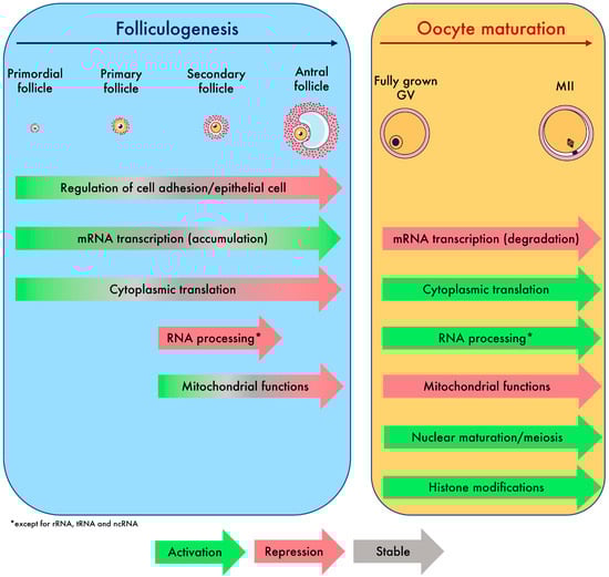 Folliculogenesis and oocyte maturation imply specific regulation during oocyte development. First, variation in chromatin accessibility determines the activity of transcription, which is high within early follicles but absent after GV breakdown [,]. Secondly, transcription factor activity shapes the oocyte transcriptome during folliculogenesis by upregulating or downregulating specific transcripts to allow the transition from a primary to a pre-ovulatory follicle oocyte []. Thirdly, selective degradation or translation of maternal transcripts is a prerequisite for cytoplasmic maturation, leading to a fertilizable MII oocyte that can ensure the first embryonic divisions [].