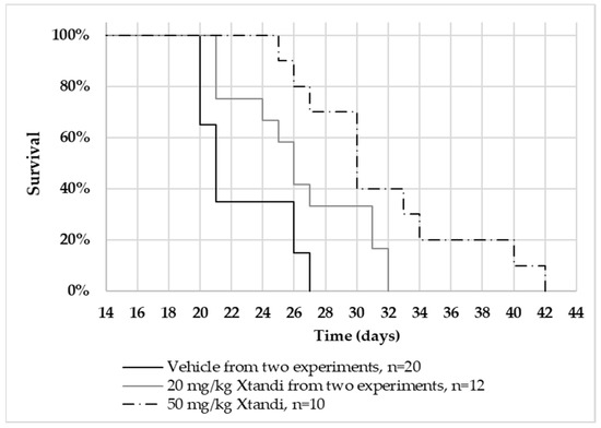 Mice bearing intracranially implanted U87MG cells (human glioblastoma) and subjected to treatment with Xtandi® (enzalutamide) at dosages of 20 mg/kg and 50 mg/kg demonstrated a significant extension in their lifespan compared to the control group that received the vehicle treatment (log-rank test; z = 2.26, p = 0.24 and z = 4.08, p < 0.001, respectively). Notably, a dose–response relationship is evident, as the cohort administered the 50 mg/kg Xtandi® dosage exhibited a more pronounced lifespan enhancement than the 20 mg/kg dosage group (Figure 1). It is important to highlight that the results presented in Figure 1 for both the vehicle group and the 20 mg/kg Xtandi group are amalgamated from two separate experiments. The initial experiment comprised a vehicle-treated group (n = 9) and a group treated with 20 mg/kg Xtandi (n = 5) (see Supplementary Figure S1A). Subsequently, an additional study was conducted, involving three study groups: vehicle (n = 11), 20 mg/kg Xtandi (n = 7), and 50 mg/kg Xtandi (n = 10) (refer to Supplementary Figure S1B). In light of the absence of discernible differences between the vehicle groups or the 20 mg/kg groups in the two studies, we opted to merge them for a more consolidated representation (Figure 1).