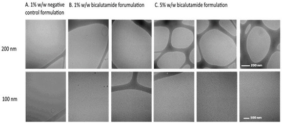 Cryo-TEM analysis revealed that the bicalutamide formulation, reconstituted at either 1% or 5% w/w of the total powder in water, was substantially devoid of particles, with a few liposome-like shapes apparent at the largest magnification (200 nm scale), similar to the negative control formulation (Figure 2). The size of the liposome-like structures that were sparsely identified in the bicalutamide-containing formulation and the formulation lacking the active ingredient was about 100–120 nm. Further analysis using dynamic light scattering (DLS) revealed no particles in the bicalutamide-containing or negative control formulation.