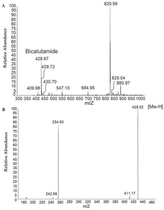 MS-HPLC chromatograms of filtrates of test formulations dispersed in water (1% w/w). (A) Formulation comprising bicalutamide, exhibiting a peak at 429 m/z, indicative of the presence of bicalutamide. (B) When the mass spectrometer was set to negative ionization mode with deprotonated ions (M-H), the recorded transition corresponded to values previously associated with bicalutamide (m/z 429.2 → 255.0).