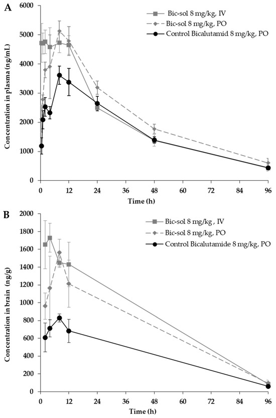 The plasma pharmacokinetics (PK) with brain penetration of bicalutamide following a single intravenous (IV) or oral administrations of the new bicalutamide formulation were tested in male CD1 mice and compared to the control bicalutamide formulation. The PK parameters are presented in Table 1. Mean plasma and brain concentration–time profiles of bicalutamide after a single dose (N = 15/group) are depicted in Figure 4A and Figure 4B, respectively.