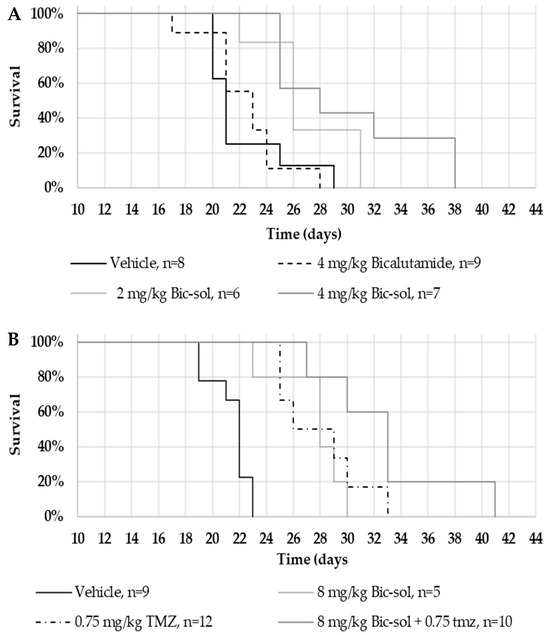 Kaplan–Meier analysis on nude mice implanted intracranially with U87MG human glioblastoma and treated with bicalutamide soluble (Bic-sol) and TMZ. U87MG cells were injected intracranially, and mice were treated 5 times weekly as indicated. (A) vehicle (n = 8; solid black line), 4 mg/kg bicalutamide dissolved in 5% DMSO in corn oil (n = 9; dashed line), 2 mg/kg (n = 6; light gray) or 4 mg/kg (n = 7; dark grey) Bic-sol dissolved in water. (B) vehicle (n = 9; solid black line), 8 mg/kg Bic-sol (n = 5; light gray line), 0.75 mg/kg TMZ (n = 12; dotted dashed line) or 8 mg/kg Bic-sol plus 0.75 mg/kg TMZ (n = 10; dark grey line). The animals were monitored for survival.