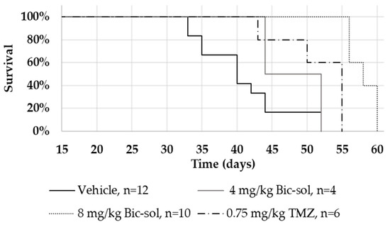 In the ZH-161 mice model, the group’s lifespan treated with 8 mg/kg Bic-sol as monotherapy was significantly longer than the group treated with TMZ (log-rank test; z = 4.28, p < 0.001) or with the vehicle (log-rank test; z = 4.69, p < 0.001) (Figure 6).