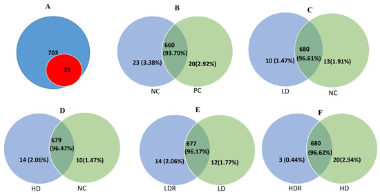 Venn diagrams of total identified proteins in the serum of pigs fed with low-protein diets with or without reduced calcium and phosphorous supplemented with a corn-expressed phytase. (A) the number of total identified proteins across biological replicates (703 proteins) with 25 proteins identified with significantly differential abundance across dietary groups, (B) NC vs. PC, (C) LD vs. NC, (D) HD vs. NC, (E) LDR vs. LD, (F) HDR vs. HD. PC (positive control): normal protein, adequate calcium (Ca) and available phosphorous (aP), no corn-expressed phytase (CEP) added; NC (negative control): low protein, adequate Ca and aP, no CEP added; LD: NC + CEP added at low dose, i.e., 2000 one phytase unit (FTU)/kg of diet; HD: NC + CEP added at high dose, i.e., 4000 FTU/kg of diet; LDR: LD with reduced Ca and P; HDR: HD with reduced Ca and P. n = 7–8 for each dietary group.