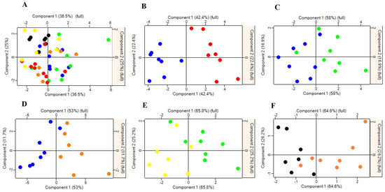 Principal Component Analysis (PCA) score plots of differentially expressed protein in the serum of pigs fed with low-protein diets with or without reduced calcium and phosphorous supplemented with a corn-expressed phytase. (A) Overall, (B) NC vs. PC, (C) LD vs. NC, (D) HD vs. NC, (E) LDR vs. LD, (F) HDR vs. HD. Each circle represents an individual pig and the red, blue, green, orange, yellow and black circles are representative of PC, NC, LD, HD, LDR and HDR groups, respectively. PC (positive control): normal protein, adequate calcium (Ca) and available phosphorous (aP), no corn-expressed phytase (CEP) added; NC (negative control): low protein, adequate Ca and aP, no CEP added; LD: NC + CEP added at low dose, i.e., 2000 one phytase unit (FTU)/kg of diet; HD: NC + CEP added at high dose, i.e., 4000 FTU/kg of diet; LDR: LD with reduced Ca and P; HDR: HD with reduced Ca and P. n = 7–8 for each dietary group.