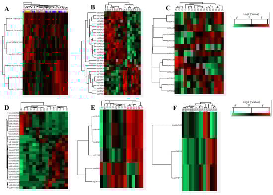 Hierarchical clustering of differentially expressed protein in serum of pigs fed with low-protein diets with or without reduced calcium and phosphorous supplemented with a corn-expressed phytase. (A) Overall, (B) NC vs. PC, (C) LD vs. NC, (D) HD vs. NC, (E) LDR vs. LD, (F) HDR vs. HD. The red color indicates high abundance, and the green color indicates low abundance. PC (positive control): normal protein, adequate calcium (Ca) and available phosphorous (aP), no corn-expressed phytase (CEP) added; NC (negative control): low protein, adequate Ca and aP, no CEP added; LD: NC + CEP added at low dose, i.e., 2000 one phytase unit (FTU)/kg of diet; HD: NC + CEP added at high dose, i.e., 4000 FTU/kg of diet; LDR: LD with reduced Ca and P; HDR: HD with reduced Ca and P. n = 7–8 for each dietary group.