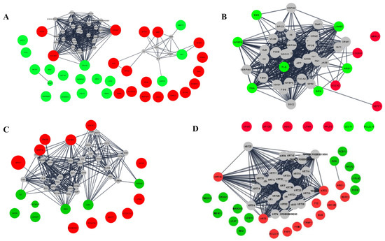 Network analysis of differentially expressed proteins in serum of nursery pigs fed with low-protein diets with or without reduced calcium and phosphorous supplemented with a corn-expressed phytase. Network of interactions of differentially expressed proteins for (A) NC vs. PC, (B) LD vs. NC, (C) HD vs. NC, (D) LDR vs. LD. No protein interactions were detected for HDR vs. HD. The red and green colors are representative of upregulated and downregulated proteins, respectively, and the grey color represents 40% of additional interactors. PC (positive control): normal protein, adequate calcium (Ca) and available phosphorous (aP), no corn-expressed phytase (CEP) added; NC (negative control): low protein, adequate Ca and aP, no CEP added; LD: NC + CEP added at low dose, i.e., 2000 one phytase unit (FTU)/kg of diet; HD: NC + CEP added at high dose, i.e., 4000 FTU/kg of diet; LDR: LD with reduced Ca and P; HDR: HD with reduced Ca and P. n = 7–8 for each dietary group.