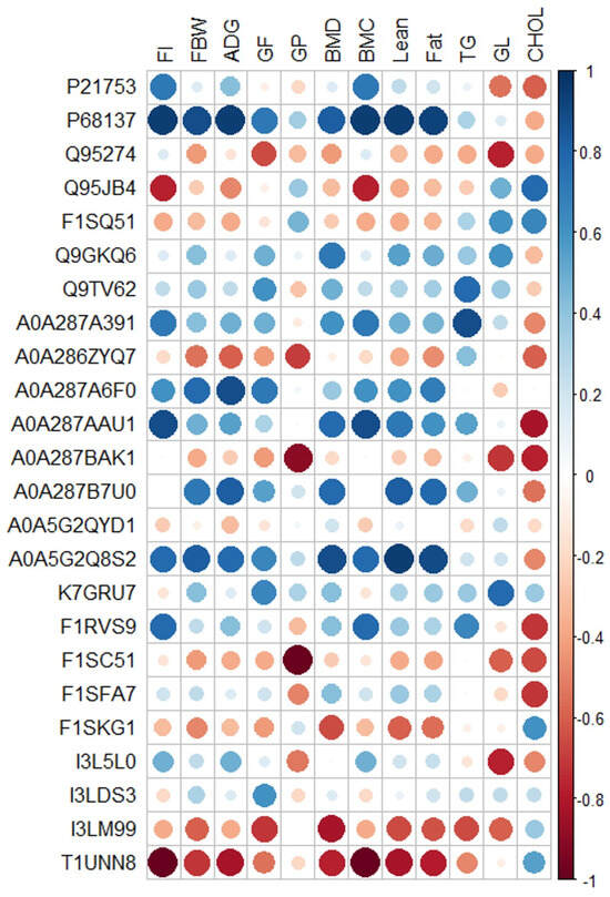 Pearson correlation analysis of overall differentially expressed proteins (protein ID) in serum of pigs fed with low-protein diets with or without reduced calcium and phosphorous supplemented with a corn-expressed phytase identified by proteomics approach and growth performance related measurements. The color of circles is based on the Pearson coefficient distribution: red represents a negative correlation (p < 0.05), blue represents a positive correlation (p < 0.05), and white is indicative of nonsignificant correlation (p > 0.05) with larger size circles having a higher correlation coefficient. Feed intake (FI), final body weight (FBW), average daily gain (ADG), gain:feed ratio (G:F), gain:protein ratio (GP), bone mineral density (BMD), bone mineral content (BMC), triglyceride (TG), glucose (GL), cholesterol (CHOL).