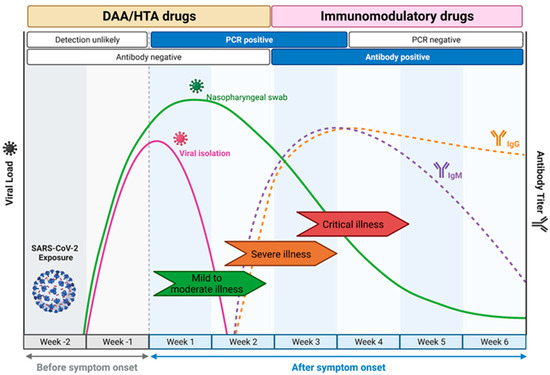 COVID-19 disease progression and the windows of opportunities where antiviral drugs should be deployed. The directly acting antivirals (DAA) and host-targeting antivirals (HTA) are most effective for an intervention in the earlier course of the mild to moderate disease manifestation when viral load is increasing and detectable by RT-PCR. The immunomodulatory drugs are more potent in the later phase of the disease when the host immune response starts to develop as a response to the infection and the clinical manifestation starts to develop from severe to critical illness due to the risks of a cytokine storm. Adapted from “Time Course of COVID-19 Infection and Test Positivity”, by BioRender.com (2023). Retrieved from https://app.biorender.com/biorender-templates, accessed on 20 April 2023.