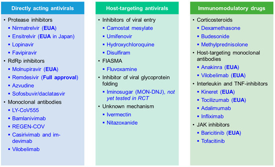 Here, we summarise recent results from randomised controlled trials (RCTs) with linked in vitro results that were performed during the COVID-19 pandemic. We present data on key candidate compounds with a direct impact on virally encoded proteins (DAA), indirect mechanisms of action depriving the virus of essential host factors needed for replication and spread (HTA), and immunomodulatory compounds (Figure 3). An overview of compounds that are now fully approved or under emergency use authorisation (EUA) for COVID-19 by the Food and Drug Administration (FDA) is shown in Table 2. Further, the World Health Organization (WHO) is releasing a living update on COVID-19 therapeutics [15]. In this review, we will summarise clinical trial results of now authorised compounds and highlight other drugs that were shown to be ineffective.