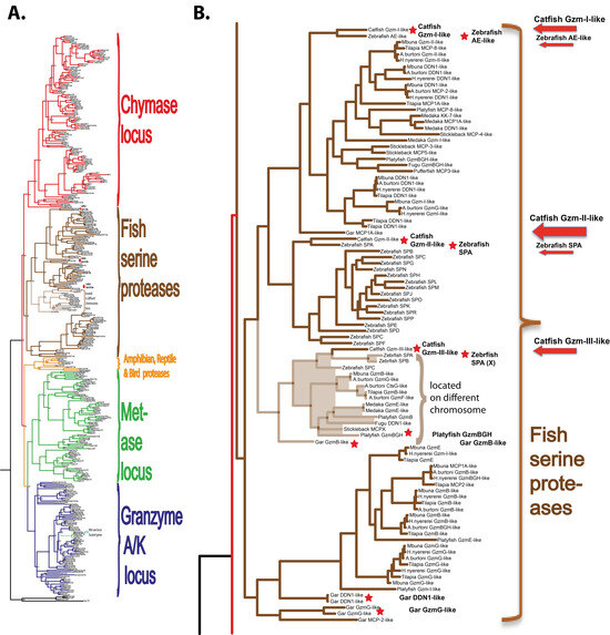 2.1. Phylogenetic Analyses of a Panel of Fish Proteases Related in Sequence to the Mammalian Hematopoietic Serine Proteases