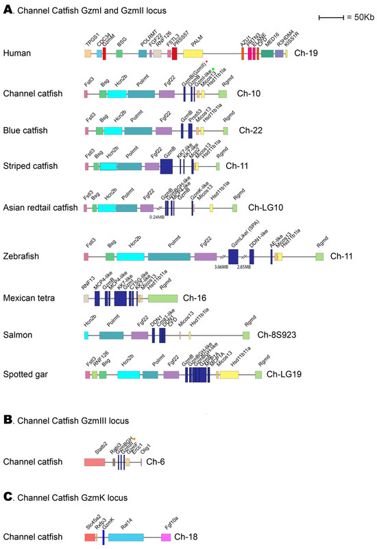2.10. The Genomic Loci Encoding the Catfish Granzyme-like I, II, and III