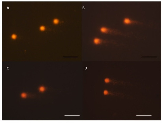 Peripheral blood cells analyzed in comet assay after exposure to biocomponents: (A)—cell from negative control; (B)—cell from positive control; (C)—cell exposed on CdS QD film; (D)—cells exposed on ZnS QD film. Magnification 400×. Scale bar 10 µm.