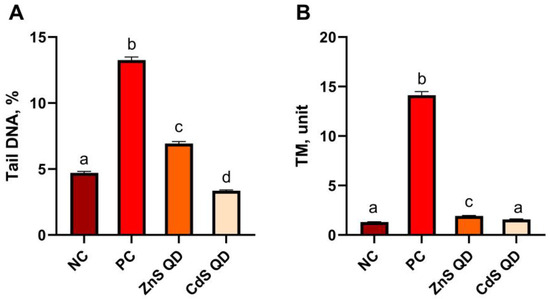 Toxicity of the analyzed composites evaluated by comet assay based on the values of the parameters tail DNA % (A) and TM (B): NC—negative control; PC—positive control; ZnS QD—ZnS QD film; CdS QD—CdS QD film; The values on the graph represent the mean and standard error; a, b, c, d—averages between groups marked with different letters are significantly different (p ≤ 0.05).