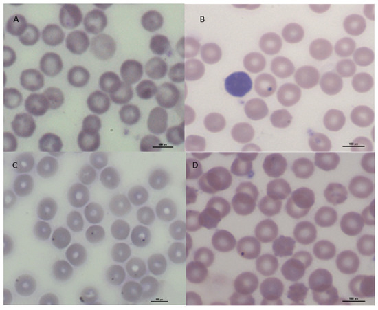 Another method to assess the toxicity of nanomaterials in vitro is the erythrocyte micronucleus assay. This method analyzes the presence of micronuclei in immature erythrocytes (PCE, polychromatic erythrocytes) from peripheral blood, which are in the final stage of erythropoiesis. Proliferating cells were treated with the tested nanocomposites, and the resulting potential damage in the form of damaged chromosomes or chromatids was observed in the cytoplasm of the cells as micronuclei (Howell–Jolly bodies). Identification of micronuclei in PCE is possible due to their different staining compared to mature, normochromatic erythrocytes (NCE). NCE erythrocytes stain pinkish-yellow, while PCEs, due to their lower hemoglobin content and RNA still present in the cell, show a pinkish-purple, pinkish-blue pigmentation [36,37]. Examples of analyzed cells in each experimental group are shown in microphotographs Figure 4A–D.