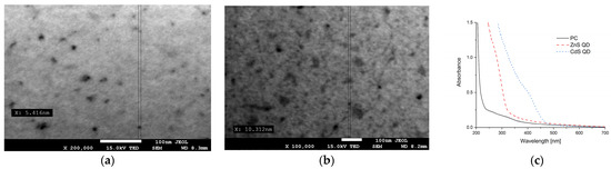 The nanocomposite films were produced following the method described by Grzebieniarz et al. [11]. Given that biopolymers can exhibit slight property variations depending on the batch, UV-Vis spectra were conducted for all films, and electron microscopy was employed for the nanocomposite ones to ensure repeatability and confirm the results. Electron microscopy images (Figure 6) demonstrate the successful synthesis of ZnS (Figure 6a) and CdS (Figure 6b) nanoparticles with average diameters of 5 and 10 nm, respectively. Additionally, UV-Vis spectra (Figure 6c) confirm the presence of ZnS and CdS nanoparticles and are consistent with previous results [11]. The concentrations of quantum dots in the resulting composites are 0.518% and 0.767% for ZnS QD and CdS QD, respectively.